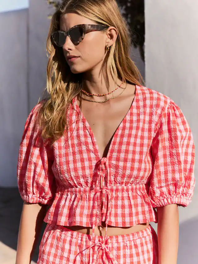 Red/Pink 100% Cotton Textured Puff Sleeve Tie Front Gingham